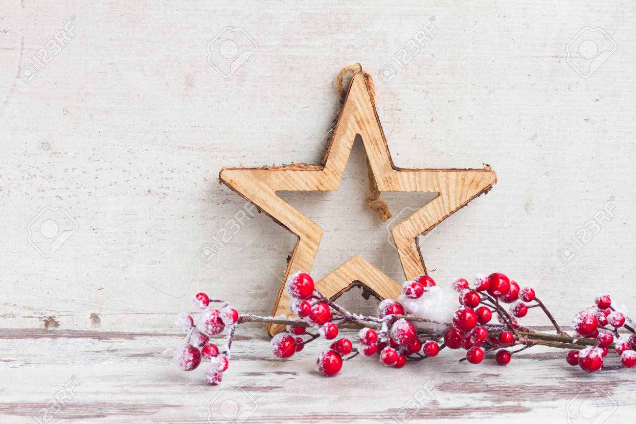 Red And White Christmas Twig With Berries And Star On Aged
